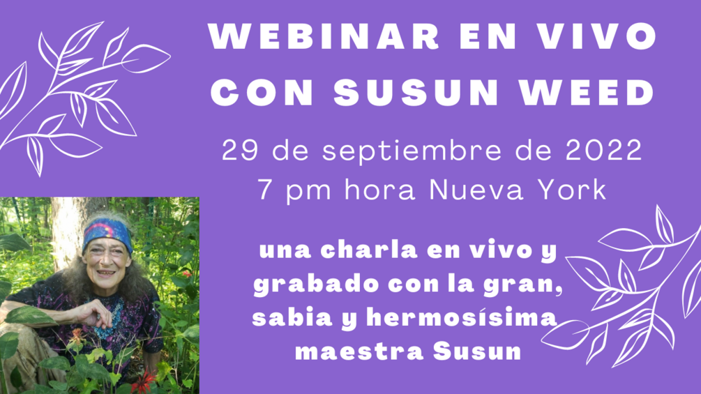 Esto es realmente maravilloso. Mi gran y hermosa maestra de herbolaria y de vida, Susun Weed, estará con nosotros EN VIVO por ZOOM el 29 de septiembre a las 18:00 pm hora Central USA.